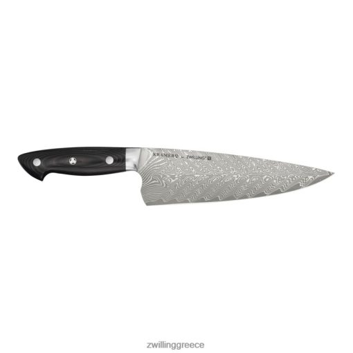 δημιουργημένο με τον master bladesmith bob kramer, η συλλογή από ανοξείδωτο χάλυβα kramer by zwilling euroline damascus διαθέτει λεπίδες από ανοξείδωτο χάλυβα κατασκευασμένες σύμφωνα με τα απαιτητικά πρότυπα του, μεγιστοποιώντας τις καμπύλες, την ισορροπία και τη χρησιμότητα. Ο σχεδιασμός του bob έχει μια εξαιρετικά φαρδιά λεπίδα για μεγιστοποίηση της απόστασης των αρθρώσεων για μεγαλύτερα χέρια και για το κόψιμο μεγάλων προϊόντων και σωρών τροφίμων. Το ψιλοκομμένο φαγητό μπορεί εύκολα να μεταφερθεί με αυτή την εντυπωσιακή, φαρδιά λεπίδα. Τα μαχαίρια φινιρίζονται στο χέρι με μια παραδοσιακή διαδικασία 3 βημάτων από έμπειρους Ιάπωνες τεχνίτες. Σε συνδυασμό με τον χάλυβα σε σκόνη μικροκαρβιδίου sg2, οι λεπίδες cryodur που έχουν σκληρυνθεί με πάγο προσφέρουν ευκρίνεια σαν νυστέρι, παραμένουν πιο αιχμηρές περισσότερο και μπορούν να αντέξουν περισσότερο ακόνισμα κατά τη διάρκεια ζωής τους. ο πυρήνας σούπερ ατσάλινο sg2 προστατεύεται από ένα εξαιρετικά όμορφο μοτίβο chevron δαμασκηνού 100 στρωμάτων, το οποίο συμπληρώνεται από μια εκπληκτική μαύρη λινή λαβή micarta και την χαρακτηριστική καρφίτσα μωσαϊκού bob kramer.