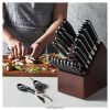 που στεγάζεται σε ένα όμορφο τετράγωνο μαχαιριών από τέφρα 21 θέσεων, αυτό το σετ συμπληρώνεται με 8, Μαχαίρια για μπριζόλα 4,5 ιντσών με σφυρηλατημένες ή στάμπες λεπίδες.