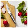 ευκίνητα, ελαφριά και εξαιρετικά άνετα, τα κατασκευασμένα στην Ιαπωνία μαχαίρια με διπλό πτερύγιο ii είναι ανθεκτικά στα τσιπ και στη διάβρωση και είναι εύκολα στη φροντίδα τους. Αυτά τα μαχαίρια διαθέτουν σκληρυμένη με πάγο λεπίδα από ανοξείδωτο χάλυβα nitro 60 ειδικής φόρμουλας, με μεγάλη αντοχή. το κυρτό στήριγμα λειτουργεί ως προέκταση του χεριού και η εργονομική λαβή από χάλυβα με χρυσαφί σχεδιασμό είναι υγιεινή και εξαιρετικά καλά ισορροπημένη, προάγοντας το κόψιμο χωρίς κόπωση ακόμη και για τις μεγαλύτερες εργασίες κοπής. Αυτά τα μαχαίρια επαγγελματικού στυλ πλένονται και στο πλυντήριο πιάτων, κάνοντας γρήγορο καθάρισμα. το 3,5 ιντσών. Το μαχαίρι καθαρισμού προορίζεται για εργασίες μικρότερης κλίμακας, όπως το ξεφλούδισμα λαχανικών και η κατάτμηση εσπεριδοειδών.