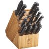 το σετ μπλοκ 18 τεμαχίων διαθέτει όλα τα μαχαίρια που χρειάζεστε για να ρυθμίσετε σωστά την κουζίνα σας. από το μαχαίρι αποφλοίωσης ράμφους μικρού πουλιού για ακριβή, περίπλοκα κοψίματα μέχρι το ολόπλευρο μαχαίρι σεφ 8 ιντσών για τεμαχισμό και κοπή σε κύβους, αυτό το σετ περιέχει τα βασικά μαχαίρια για όλες τις εργασίες, μαζί με ένα κοφτερό και ανθεκτικό σετ 8 μαχαιριών για μπριζόλα, κουζίνα ψαλίδι και ένα ατσάλι ακονίσματος για να διατηρήσετε τα μαχαίρια σας με τις λεπτές άκρες σε κορυφαίο σχήμα. Το σετ στεγάζεται σε ένα όμορφο μπλοκ μαχαιριού από μπαμπού.
