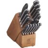- περιλαμβάνει μαχαίρι ράμφους πουλιού 2,75″, μαχαίρι καθαρισμού 3″, μαχαίρι καθαρισμού 4″, οδοντωτό βοηθητικό μαχαίρι 5 ιντσών, 5″ Μαχαίρι santoku, μαχαίρι santoku 7″, μαχαίρι σεφ 8″, μαχαίρι ψωμιού 8″, μαχαίρια μπριζόλας 6 x 4,5 ιντσών, ψαλίδι κουζίνας, ατσάλι ακονίσματος, μπλοκ σκληρού ξύλου