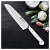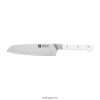 το pro le blanc λεπτό μαχαίρι santoku 7 ιντσών είναι τέλειο για λεπτομερείς εργασίες κουζίνας. santoku – Ιαπωνικό για “τρεις αρετές” – υπερέχει σε τρεις τεχνικές κοπής: ψιλοκόψτε με επιδεξιότητα το σκόρδο, το αγγούρι σε φέτες και το κρεμμύδι σε κυβάκια με αυτό το ασιατικό ολόπλευρο εργαλείο, του οποίου η λεπίδα στην κοίλη άκρη έχει μικρές εσοχές, γνωστές και ως γραντονιές, που εμποδίζουν το φαγητό να κολλήσει κατά το κόψιμο .