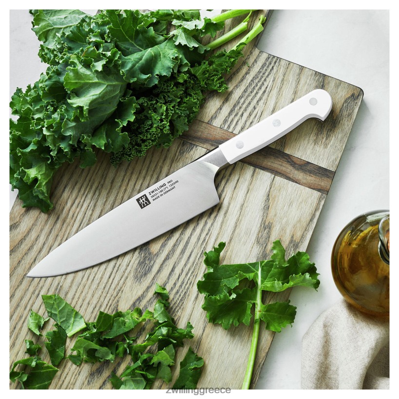Το zwilling pro, το πιο φιλικό μαχαίρι στην αγορά, είναι τώρα διαθέσιμο με κομψές λευκές λαβές. Το zwilling pro le blanc μπορεί να υπερηφανεύεται για ένα μοναδικό κυρτό στήριγμα που λειτουργεί ως προέκταση του χεριού, υποστηρίζοντας την επαγγελματική λαβή, με τον αντίχειρα και τον δείκτη στη λεπίδα, για ασφαλή κοπή και λιγότερη κούραση. η λεπίδα σχεδιάστηκε με μια ευρεία καμπύλη στο μπροστινό μέρος για να διευκολύνει την κουνιστή κίνηση της δυτικής κοπής, ενώ η ίσια πλάτη είναι ιδανική για την ασιατική κίνηση κοπής. μπορεί να χρησιμοποιηθεί όλο το μήκος της λεπίδας κατά την κοπήκαι μπορεί να ακονιστεί από το στήριγμα μέχρι την άκρη.